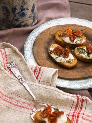 *Snittar med semitorkade tomater och ricottakräm * Det här receptet räcker till 8 personer om alla äter 2 smörgåsar var.