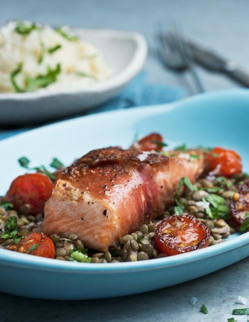 Den feta laxen trivs som fina fisken i sällskap av salt skinka, mustiga linser och aromatisk salvia. Linserna blir extra mustiga när man kokar dem med vin och buljong. Dessutom har de gröna linserna från Puy charmen att behålla en tuggvänlig kärna. Nyttigt och gott, både i samma mening och tugga. Den som vill frångå det nyttiga och addera något krämigt serverar gärna en smaksatt crème fraiche till.