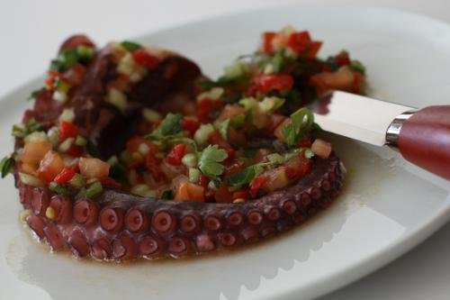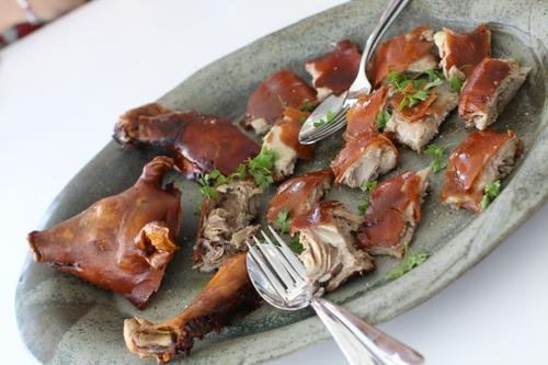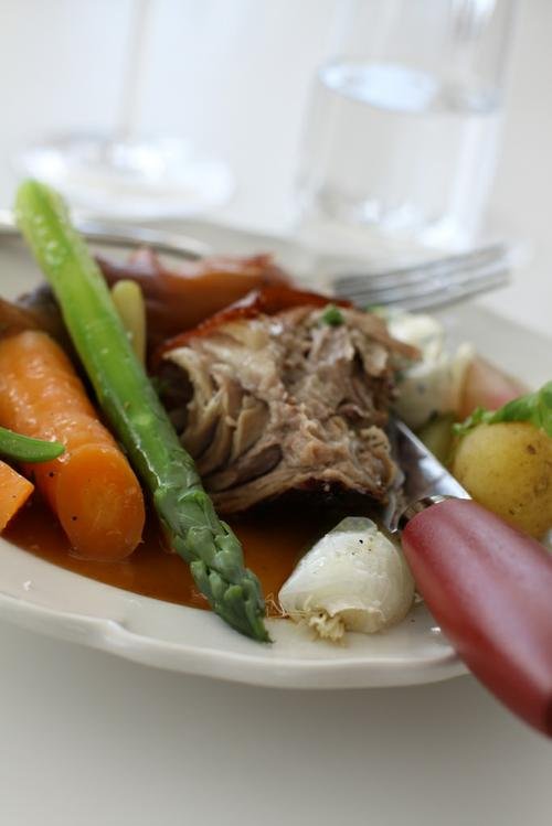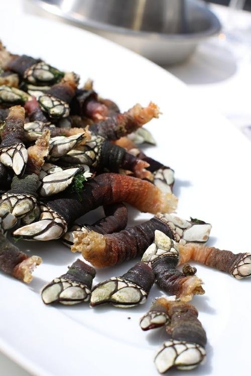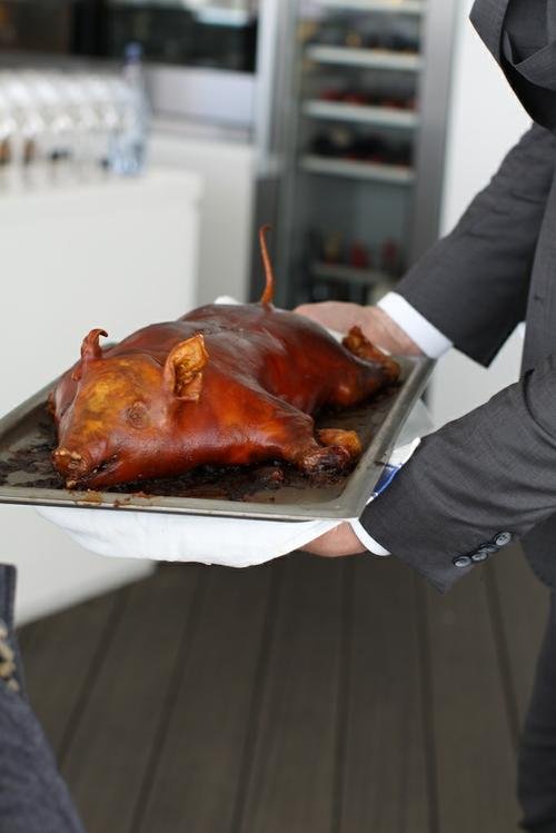 Så till maten igen. Kocken för veckan var Johan Jureskog som driver Rolfs kök och AG. Han är ett stort fan av det rustika och det märktes. Jag gillar det raka och okomplicerade som Johan står för och jag älskar att han vågar bjuda på t ex långhalsar som aptitretare samtidigt som jag hatar det. För det betyder ju att jag har missat en rätt, som kanske var god. För långhalsar, eller Percebes* som de heter på spanska, är inte särskilt gott, om man inte gillar att “hångla med havet” som restaurangchefen beskrev dem. Kul och intressant men inte särskilt roligt i längden. Den första aptitretaren var däremot precis i min smak, råbiff med nötfettskonfiterade brödsmulor och kalixrom. Den andra – tuppkam med sommarkantareller var också god med höga smaker även om kammen smög obemärkt förbi, samt att jag saknade lite syra. Sen var det dags för bordsservering och de riktiga hard-core grejerna. Till förrätt fick vi direkt användning av morakniven. In kom gigantiska fat med långkokt, varm bläckfisk med salsa och svart aioli. Kanske hade jag ätit för många långhalsar (jag tog 4 stycken) eller så är det nu jag kan konstatera att bläckfisk inte är min tepåse. Det var gott, perfekt parat med rökig paprika, stark och syrlig salsa och krämig aioli, men lite för mycket. Det var jag nog inte ensam om att tycka med tanke på hur mycket mat som var kvar på faten. Till varmrätt kom spädgrisen. Först inburen på bleck till allmän beskådan och sedan i retur på fat i mer ätbart skick. Helt fantastiskt gott! Krispiga primörer, en pikant majo-baserad sås och fläsksky till. Till efterrätt en flamberad rispudding med persikor, kolaglass och vaniljsås. Jättegott men kanske inte vad man vill äta efter ha klämt en halv gris.
