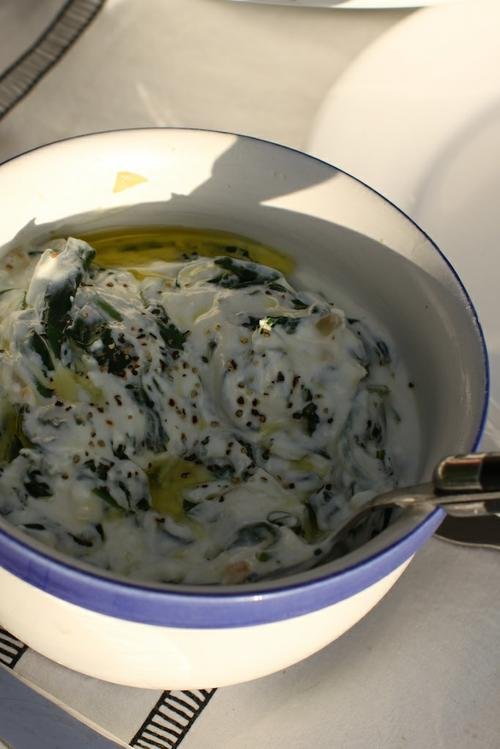 Skala och hacka vitlöksklyftorna. Fräs dem i olja tills de blir lätt brynta men inte brända. Råkar de bli de senare så slänger du dem och börjar om, bränd vitlök smakar bittert och är inte gott. När vitlöken är färdig för första eller andra gången lägger du i bladspenaten och låter den bli mjuk. Ställ bort pannan från plattan och låt spenaten svalna. Smula ned fetaosten och rör ner yoghurten. Smaka av med salt, peppar och olivolja. Vill du ha mer rock´n roll så krydda gärna med lite chiliflakes. Saknar du något så blir det gott med rinrivet citronskal eller finhackad mynta eller persilja i såsen. Ställ kallt i väntan på servering och känn dig nöjd över ditt mod. En tzatsiki till på reportoaren.