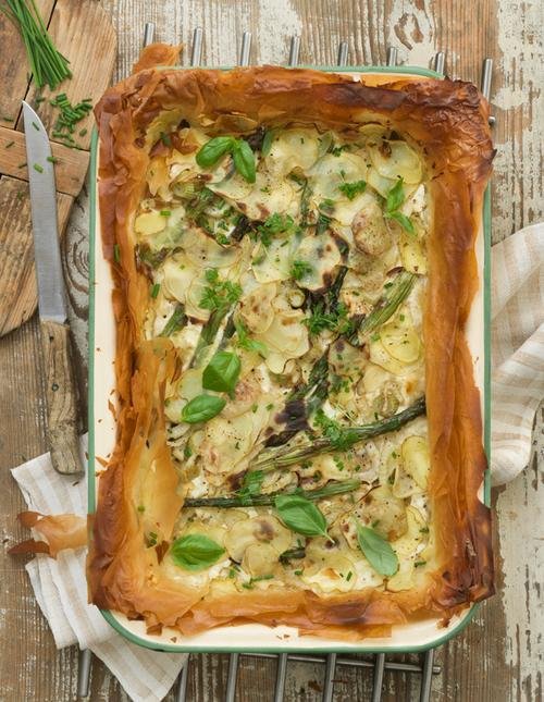 2 vitlöksklyftor 2 buntar grön sparris 1 litet fänkålhuvud 50 g parmesanost eller pecorino 1 burk 10% kesella 2 msk pepprig olivolja 50 g smör 5 ark filodeg 200 g färskpotatis salt, svartpeppar lite färska örter t ex körvel, gräslök eller basilika
