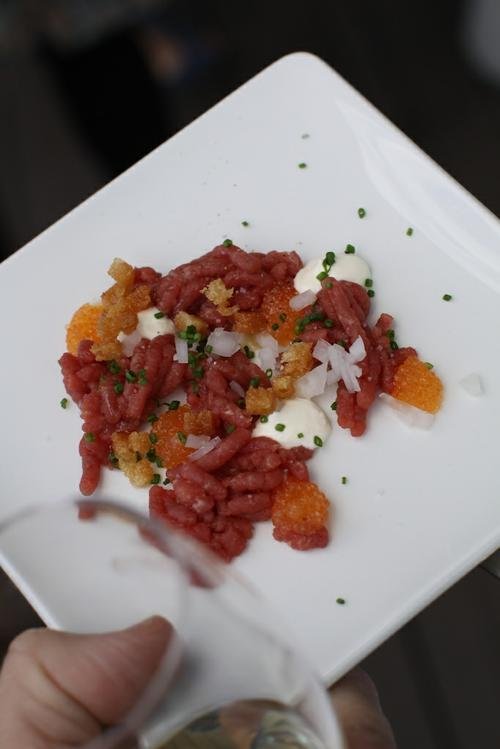 Min lunch var vad man skulle kunna beskrivas som en “conversation piece”. Nu känner jag att jag måste backa bandet och förklara konceptet lite. Jag åt alltså lunch på The Cube by Electrolux på Operakällarens tak. The cube är en kub (!) som man har lagt (jo, faktiskt) på taket. Tydligen var byggprocessen extremt komplicerad, huset är K-märkt och man fick bland annat bara bygga nattetid mellan 23.30 och 07.00. Detaljerna är lite champagne-diffusa men google finns för den siffer-intresserade. Enligt event-ansvarige är syftet med hela jippot att visa att det går att laga mat i världsklass i Electrolux hemmakök. Ur pr-synpunkt verkar The Cube vara väldigt lyckat även om det där med att laga maten i köket är en halvsanning. Som alltid trivs kockarna bäst på hemmaplan och preppar (förbereder och gör mise en place) i sina resp. restaurangkök eller i Operakällarens kök. Men arrangemanget var magnifikt, servicen på topp och utsikten var och är helt ordlös.