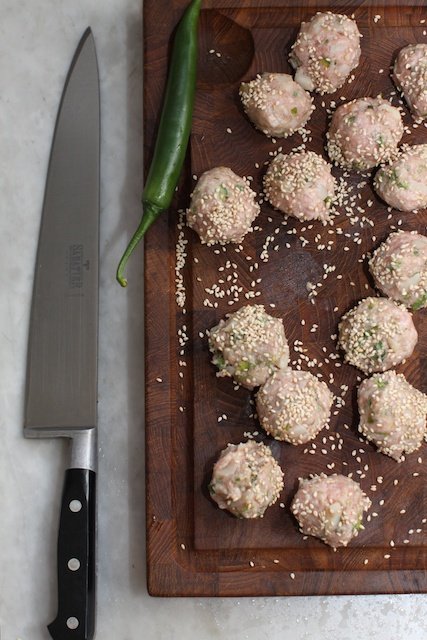Kärt barn har många namn. Rara bullar har detsamma. De här köttbullarna kan man kanske kalla vietnamesiska men eftersom jag har smugit in vattenkastanj har det nog snarare blivit en asiatisk bastard. Vattenkastanjen ger knaprighet till de saftiga, ganska milda bullarna och sesamfröna bidrar med en nötig smak. Om man gillar hetta tycker jag man ska trycka till med dubbel mängd chili och ingefära. Jag hade nämligen en lömsk baktanke, att göra en variant på köttbullar till mina barn, som även jag gillar. De genomskådade mig direkt…