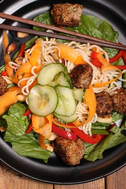 Asiatiska blandbarnsbullar med nudelsallad Istället för nudelsallad till går det fint med ångat jasminris och wokade grönsaker. Fläskfärsen går bra att ersätta med kycklingfärs.