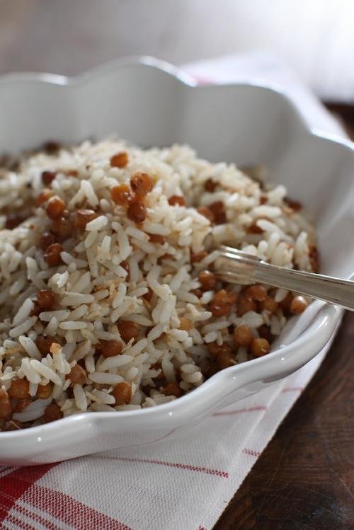 Rosta kokos och gula senapsfrön i en torr stekpanna tills riset börjar få gyllenbrun färg och senapsfröna börjar poppa. Vänd ner riset och linserna och låt allt bli varmt. Tillsätt lite olja om du vill ha ett krämigare ris och en skvätt ljus soja om du saknar sälta.