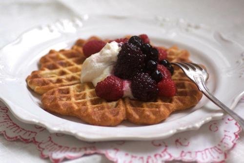 Är det bra eller dåligt att fylla år den 25 mars? Det beror på om man gillar våfflor skulle jag säga. Idag firar jag alla födelsedagsfyllare med en våffla med många vuxenpoäng – dinkelmjöl, kesella, citronkräm och syltade bär. Det senare är enklare än det låter – nämligen bär blandade med sylt.