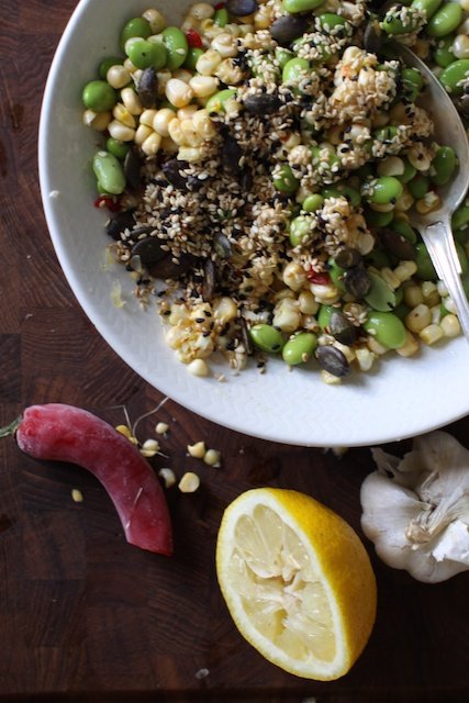 Rå majssallad med edamamebönor och rostade sesamfrön 4 små portioner