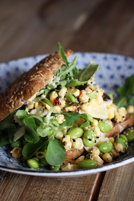 Så idag till lunch blev det rå majssallad med inspiration hämtad från Heidi på 101 cookbooks. Majssalladen varvades med en syrlig hummus och sallad mellan två bröd. Den hade säkert varit grymt som tillbehör till både kyckling och kött.