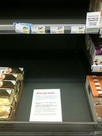 Vad ska man säga..tidstypiskt kanske? Det enda smör som fanns var ett (1) singelpackat smörpaket för 30489 kr kilot och flytande smör- och rapsolja. Inget EMV, intet finskt, nada utomsocknes å inget arlalaaaa.