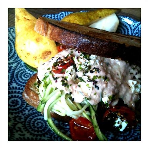 Det kan inte vara lätt att vara färskost. Först blir man ihoprörd med ljus miso. Sen blir man överöst med ingefärsmarinerad squash, chipotlehummus, fetaost och lätt-torkade körsbärstomater. Några försök att lätta upp stämningen görs med lite furikake innan man blir tillplattad av en smörstekt skiva surdeg, visserligen dagsfärsk men ändå. Med facit i hand kan man inte säga att misofärskosten kom till sin rätt. Nästa gång ska den nog ätas med avokado, eller något annat mesgott. En god macka var det ändock så här post julkampanjsfotografering