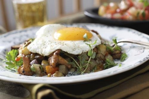 Skördepytt 1 gul lök 2 vitlöksklyftor 2 palsternackor 9 potatisar, t ex mandel eller amadine 3 morötter 400 g jordärtskockor 1 l färska kantareller, trattisar och blandsvamp, rensad smör och olja till stekning stekt ägg och färska örter till servering salt och svartpeppar