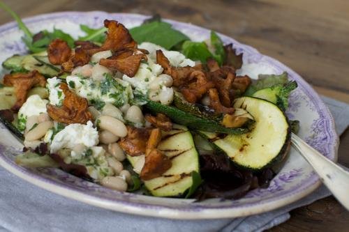 1 st squash, ca 500 g 0,5 st liten citron 2 msk hackade örter t ex basilika, timjan och grönmynta 3 msk olivolja 0,5 tsk socker 1 burk små vita bönor, ca 400 g 150 g fetaost 80 g babyleaf eller rucolasallat Salt, svartpeppar Lite smörstekta sommarkantareller Olja till grilllen