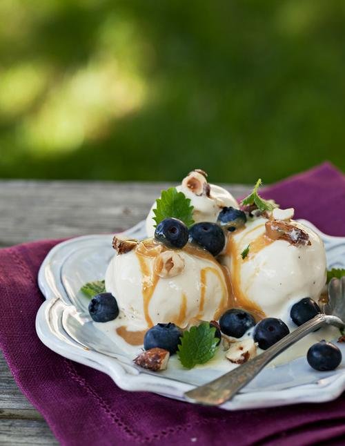 Till servering: Vaniljglass Blåbär, ananas eller annan frukt Citronmeliss till garnering