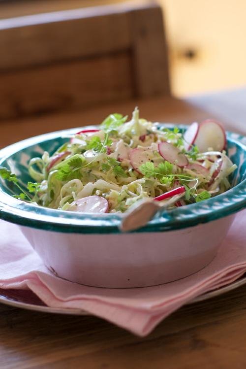 Sparris i alla ära men det är underbart att kunna frossa i krispiga och spröda “basgrönsaker”. Mild spetskål, peppriga rädisor och krispig purjolök kommer till sin rätt i en lätt primör-coleslaw. Just idag skulle jag nog servera kalvfärsbiffar med svecia på smörstekt surdegsbröd till. Imorgon skulle jag kanske steka fina fisken. Salladen är även god till grillat kött eller hamburgare, gärna med en rökig barbequesås.