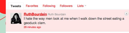Ruth Reichl är en känd amerikansk matjournalist. Anthony Bourdain är en känd fransk-amerikansk kock. Vem Ruth Bourdain är vet ingen men hon/han har gjort en riktig mash-up. Ruths twitterinlägg kombineras med Anthonys hjärna och resultatet blir strålande. Skjukt roligt, särskilt när man vet hur en geoduck clam ser ut.