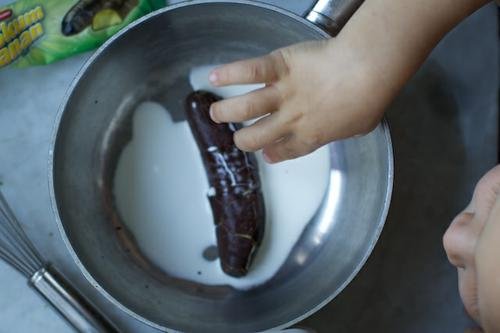 Ta bort etiketten från burken. Lägg den i en stor kastrull och fyll på med vatten. Sjud i 3 timmar. Fyll på med vatten under tiden, det får inte koka torrt. Tag upp och låt svalna. Rör eventuellt ut krämen med mjölk, grädde eller vatten om den blir för tjock.