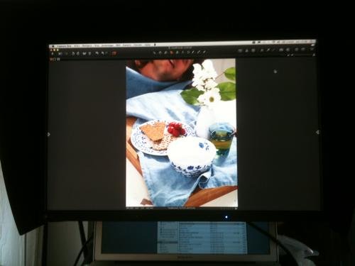 Han som ligger på brickan är fotograf. Matfotograf. Jag är stylist och så här ser det ut när vi har börjat göra vår tolkning av skandinavisk frukost. 45 minuter senare är bilden klar. Då är pålägget på, det är kaffe i koppen, filmjölk i tallriken och massa annat gott på brickan. Och fotografen?! Han är bakom kameran….