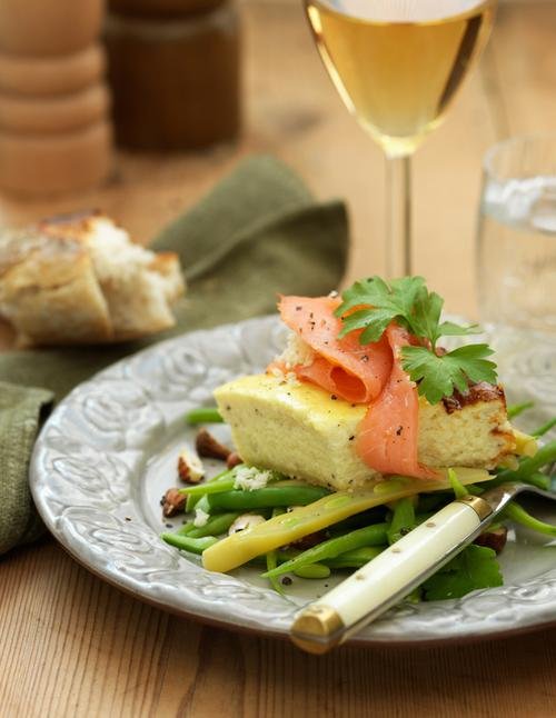 Blanda ströbröd och parmesanost. Smörj en ugnssäker med smör. “Bröa” med ströbrödsblandningen på kanterna och häll resten i botten. Blanda samman övriga ingredienser till fyllningen och häll den i den ”bröade” formen. Grädda i 175° i ca 35 minuter eller tills pajen har stannat. Lägg eventuellt på lite folie efter halva gräddningstiden. Låt svalna något innan cheesecaken skärs i portionsbitar. Servera med nötiga bönor och t ex lax eller skinka, gräddfil och pepparrot.