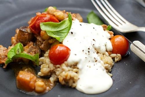 Skär aubergine med skalet kvar i tärningar 1×1 cm. Finhacka löken. Fräs auberginen mjuk i olja i ca 5 minuter under omrörning. Tillsätt löken och stek ytterligare 3 minuter på ganska svag värme. Höj temperaturen och tillsätt lammskav. Bryn ca 4 minuter tills skavet har fått färg. Tillsätt tomaterna och kryddorna. Späd med 1-2 dl vatten och koka ihop. Spola av kikärtorna, tillsätt och låt allt blir varmt. Smaka av med mer kryddor, salt och peppar. Blanda yoghurt, majonnäs och pressad vitlök. Smaka av med salt och peppar. Koka mathavre eller couscous till. Strö gärna över hackade aprikoser och lite färska örter vid servering. Pitabröd och pfefferoni är också gott till.