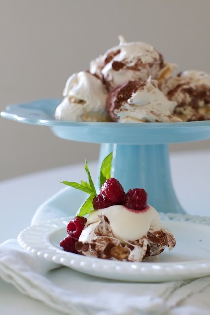 Som med med mycket annat i världen är det valfrihet som gäller. Man kan göra små eller stora maränger eller en hel tårta. Oavsett form passar marängen att fylla eller toppa med vispad vaniljgrädde, glass och härliga bär (frysta går bra när blommorna inte blommar längre). Har jag äggulor över gör jag en curd, tex på mango eller hallon eller så köper jag färdig lemoncurd på burk. Den senare blandar jag med lite fet yoghurt. Grädden brukar också vara god att blanda med lite yoghurt för att balansera upp det söta. Överst brukar jag strö färska örter som basilika, mynta och citronmeliss. Är bären färska och syrliga blir det gärna ett örtsocker. Och om det är säsong underbart knastriga passionsfruktskärnor. De små snyggingarna på bilden är rullade i kakao och rostade mandelspån och på enklast möjliga vis toppade med vaniljgrädde, hallon och mynta.