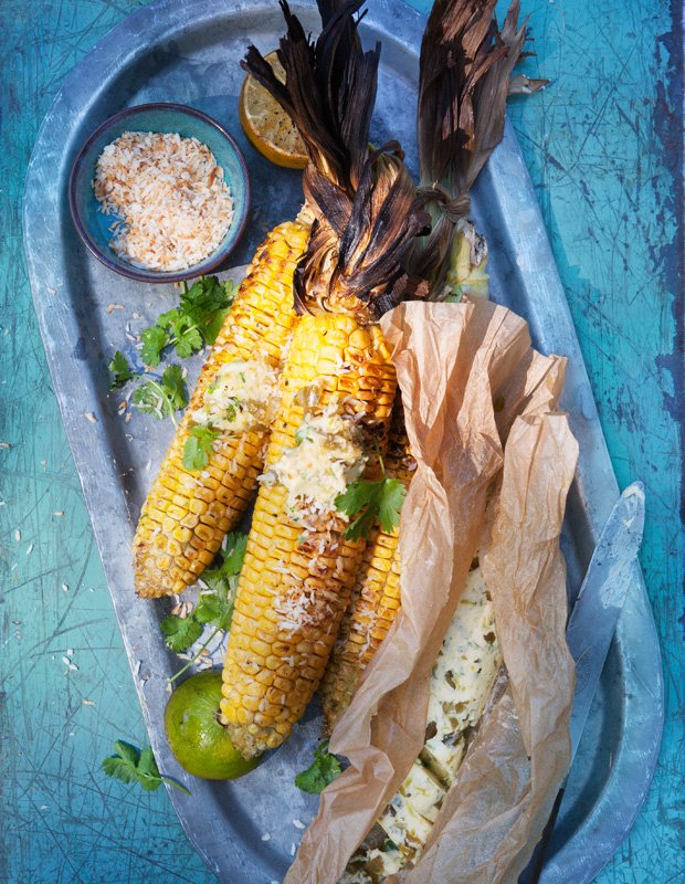 Blanda samman ingredienserna till smöret. Smaka av med salt. Lägg smöret på en bit smörpapper och rulla ihop till en rulle. Lägg i kylen. Grilla majskolvarna ca 15-20 minuter, gärna på indirekt värme, tills de är färdiga. Vänd dem ofta. Servera med smöret, strö över kokos och garnera med koriander vid servering.