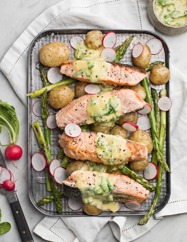 Klassiska smaker med ljuvlig smak av ramslök. Gör laxen och sparrisen i ugnen så blir detta lättlagad mat till många. Smöret till hollandaisen ska vara kylskåpskallt, det hjälper till att hålla temperaturen nere så att såsen inte spricker. 4 portioner