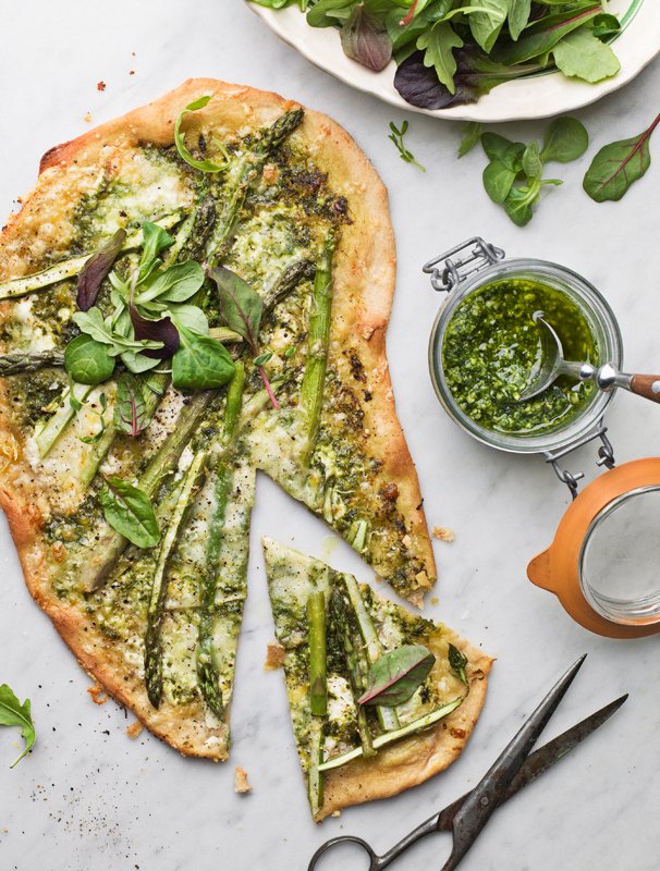 Pizzan 1 knippe sparris 2 dl ricotta 1 dl ramslökspesto 2 mozzarella á 130 g 4 msk västerbottensost 80 g färska örter och sallad t ex mache, basilika och mejram svartpeppar