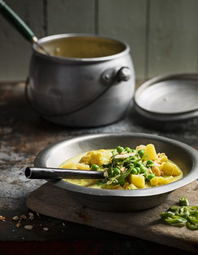 Potatiscurry med spenat & ärttopping En sydindisk variant på potatisgrytan Aloo gobi mättar fint. Servera med ett gott bröd och lite extra chili. Fast eller mjölig potatis är en smaksak. Jag väljer hälst en fast sort som är något mjölig, t ex Blue Belle. Det gör grytan fylligare. Om du råkar vara lycklig ägare till ett par (frysta) curryblad får du gärna slänga med dem. Tyvärr är de svåra att få tag på i Sverige men de gör gott för (den indiska) smaken.