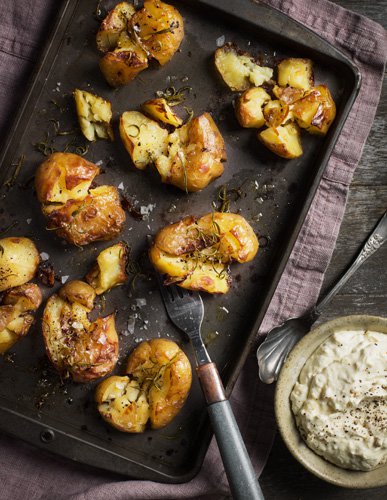 Krossade potatisar med rosmarin och rostad vitlökskräm Ugnsrostade potatisar som får ett krispigt skal och ett mjukt inre. Gott tillbehör till stekt kött eller lax, gärna med lite kokta grönsaker. Välj gärna en fast sort med smörig, söt smak och i lite mindre storlek. 4 portioner