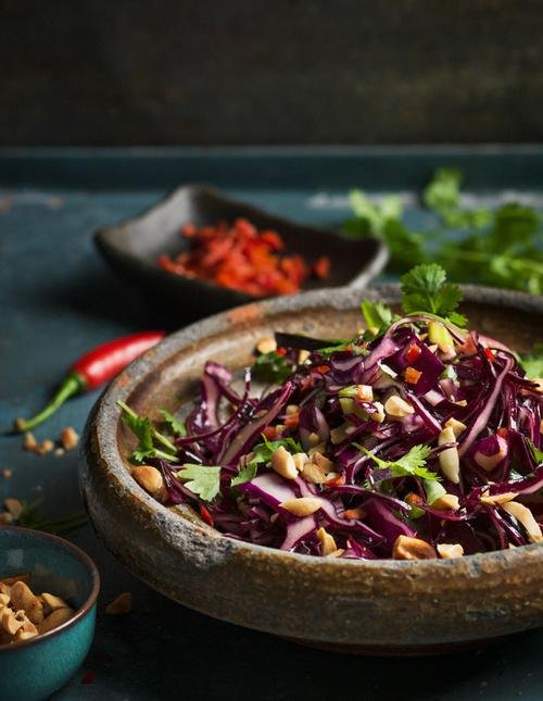 Krispig asiatisk sallad på rödkål och nötter Fina färger och smak av Thailand i en krispig sallad med rödkål. God till asiatiska rätter eller bara enkelt serverad med stekt panerad fisk eller grillad kyckling. 4 portioner
