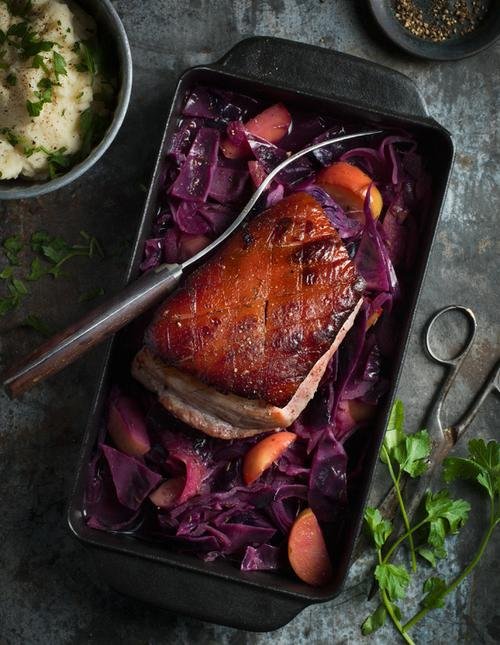 Ta bort mittstocken på kålen och skär den i minde bitar. Skala och strimla rödlöken och klyfta äpplena. Lägg allt i en djup ugnsfast form. Blanda juice, vinäger och salt häll över kålen. Klicka över smöret. Skär svålen i rutor. Mortla kummin, fänkål och peppar. Klappa in hälften av krydorna på fläsket och lägg det ovanpå kålen med svålen uppåt. Strö resten av kryddorna på kålen. Täck med folie. Baka i 200 grader i ca 1,5 timme min tills innertemperaturen är 60 grader. Höj värmen till 250 grader och sätt på grill. Rör om i kålen och ringla honungen över både kålen och fläsket. Sätt in formen högt upp i ugnen och baka i ytterligare ca 10 min, utan folie, tills svålen är krispig med fin färg. Skär fläsket i tunna skivor och servera med kålen och potatismos. Garnera med bladpersilja.