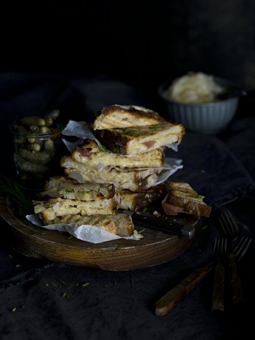 Små croquesnittar med cornichons Krämig ost, stark senap och syrlig surkål blir helt ljuvligt i de här grillade croquesnittarna. 4-6 portioner