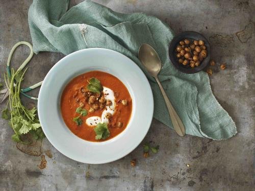 Tomatsoppa med rostade kikärter En mild, slät soppa som toppas med kryddiga kikärter för knaprighetens och proteinernas skull. Gör rätten mer barnvänlig genom att ta bort kryddorna på kikärtorna, de i soppan brukar slinka obemärkt förbi eftersom de är milda och soppan är slät. Ett hett tips är att göra dubbel sats av kikärterna eftersom de är försvinnande goda. 4 portioner
