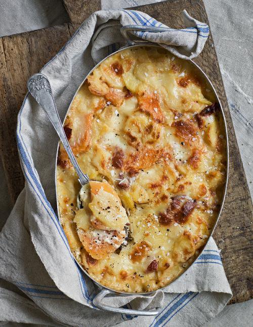 Krämig rotfruktsgratäng med taleggio Ljuvlig, krämig gratäng på vinterns alla rotfrukter. Använd helst fast potatis annars blir gratängen mer som en kompott. Sötman från tomaterna lyfter smaken på kålroten och ingefäran ger en fin liten hetta.