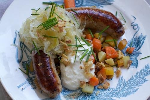 Bor man på Kungsholmen så är det ju skam om man inte äter korv flera gånger i månaden. Här bor nämligen Stockholms bästa korvmakare Taylor & Jones. De har ju mycket annat gott också och hade jag haft mer pengar i plånkan så hade jag köpt deras sjukt fina hängmörade entrecote. En spindel hade blivit imponerad av den marmoreringen. Jag blev både imponerad och hungrig och köpte fler korvar än jag tänkt. Till korven blev det söt rotfruktspytt, syrlig surkål, krämig pepparrotskräm och knaprig lök. En perfekt kombo helt enkelt. Om du inte har tid att ägna 30 minuter av ditt liv åt att steka rotfrukterna så blir det gott men surdegbröd eller kokt potatis. Surkålen blir extra god om man kokar om den med vin, fond och kryddor. Känner man för att göra extra allt med allt så ska man lägga 45 minuter på det. Gitto har ett bra recept.