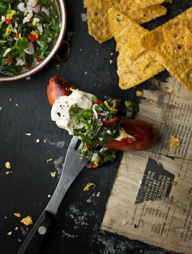 Kärna ur och finhacka chilin. Skala och finhacka löken. Repa och finhacka alla örter. Blanda samman alla ingredienser, smaka av med salt och peppar. Ställ kallt. Grilla eller stek korven i lite olja. Lägg den i ett bröd och toppa med chimichurri, crème fraiche och krossade tortillachips.