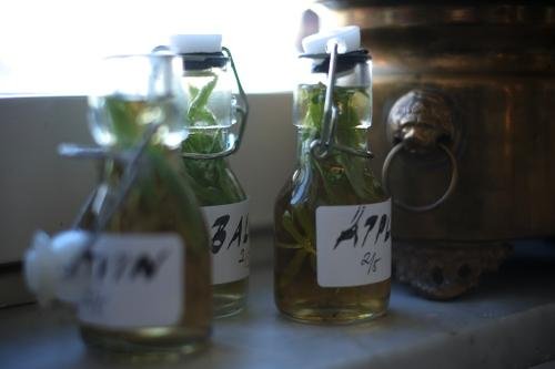 Repa bladen av vinäger. Skölj den gärna. Lägg bladen i stora eller små flaskor. Fyll på med valfri vit vinäger så att bladen täcks. Sätt på locket och vänta i 1 månad. Du behöver dock inte vänta sittandes tittandes på flaskorna.