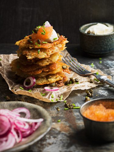 Nu när jag skriver ordet råraka rinner snålvattnet till. Det blir inte någon fors, mer som en lätt porlande bäck av välbehag. Råraka är en rätt som jag gärna återkommer till när det vankas förrätt och som jag ofta väljer om jag går på klassiska restauranger. Men så tycker jag också att allt med fett och potatis blir gott. Här har jag uppdaterat klassikern med lite nya tillbehör – krämig smetana, krispig kapris, söt syltad lök och lyxig löjrom. Hur gott som helst om du frågar mig.
