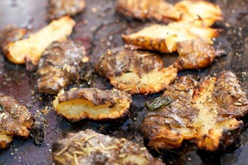 Skölj jordärskockorna och se till att de är jordfria. Koka dem mjuka i lättsaltat vatten. Koktiden beror på storleken men ca 20 minuter. Häll av vattnet och torka dem torrt. Lägg skockorna på en plåt med bakplåtspapper eller på en smord plåt. Krossa skockorna med handen eller med baksidan på en träslev. Häll på olivolja och rosmarin, krydda med salt och peppar. Baka skockorna i 200° i 20-30 minuter. Skockorna ska vara gyllenbruna på utsidan och mjuka i mitten. Du kan behöva vända dem en gång så att de inte blir brända på undersidan. Det går också bra att steka jordärtskockorna i en stekpanna, ca 5 minuter på vardera sida i oljan.