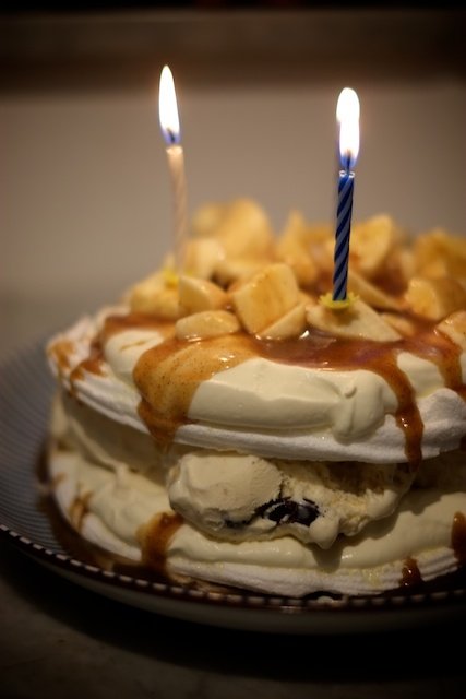 Nytt år med nya vanor. En riktigt bra och god vana är ju att göra ännu godare mat, som till exempel en riktigt smaskig kolasås. Jag skulle nog kalla detta kolasåsernas kolasås med nötig smörig smak av brynt smör, djup av några kryddmått salt och extra smak av vanilj. Såsen toppade minstingens snabbgjorda födelsedagstårta – banoffietårta gjord på färdiga marängbottnar, vispad grädde, bananglass (Ben&Jerry), bananer och kolasås. Behöver jag säga att det var supergott?