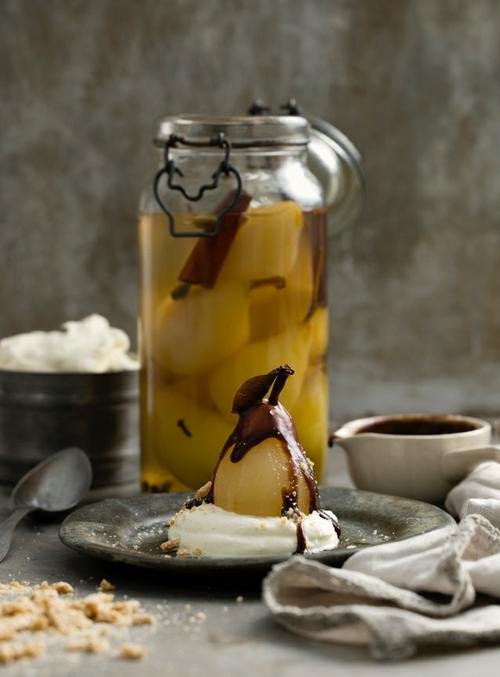 En klassisk dessert med en modern twist – lakritskolasås och sesamkakor. Välj fasta päron så håller de formen bättre. Täckta med sockerlaget så håller päronen över en vecka i kylskåpet.