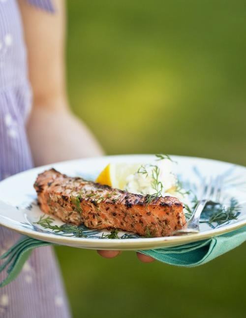Härliga svenska smaker i en torrmarinad, eller rub som det också kallas, läggs på laxen innan grillning. Gör gärna en stor sats och spar till nästa gång, den höjer verkligen laxen till nya höjder. Den som vill ha lite mer drag tillsätter lite chiliflakes. Äppel- och fänkålstzatsikin svalkar gott till.