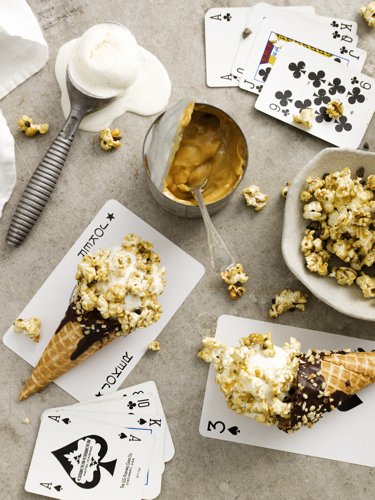 Gör kulor av glassen och rulla dem i popcorn. Lägg glassen i strutar och häll över kolasås.