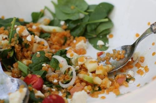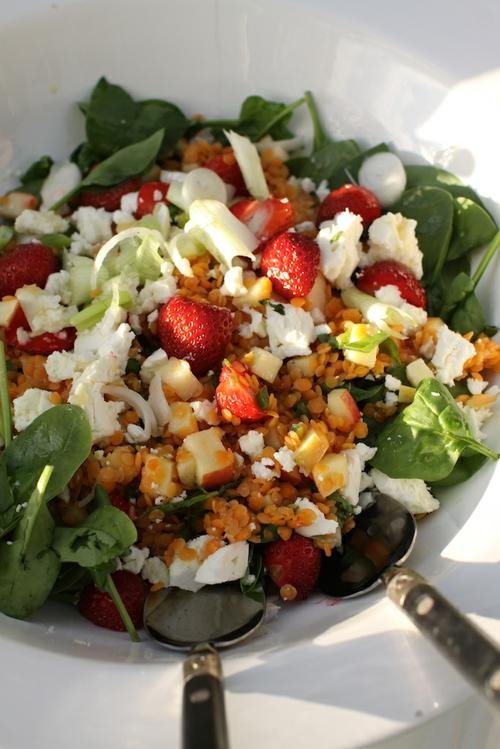 Koka linserna med valfri metod. Jag förespråkar 1-minuts metoden. Häll av överflödigt vatten och låt dem svalna. Finhacka äpple, chili, strimla salladslök och mynta. Skölj och lägg spenaten i botten av en stor skål. Lägg på linsröran. Toppa med fetaost, jordgubbar och lite rostade nötter. Blanda till en dressing på citronsaft, honung och olivolja och krydda med salt och svartpeppar. Häll över dressingen strax innan servering.
