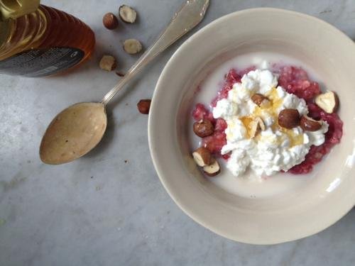 En perfekt kombo mellan syrlig hallongröt, söt mandelmjölk, gräddfrisk cottage cheese och knapriga hasselnötter. Gott och nyttigt.