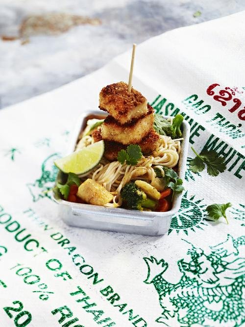 Det här är inte någon renlärig thailändsk rätt men en mycket god blandasiat. I Thailand hade de nog haft stekt räkor i woken men vi väljer en krispig närproducerad fisk. Panko är ett japanskt ströbröd som gör frasiga under med fisken. Köp när du hittar och använd precis som vanligt ströbröd. Med den skilladen att Panko är tusen gånger godare. Maten är lätt att barnanpassa – fisken är frasig och mild som det är lätt att lägga undan lite nudlar och grönsaker, innan de blandas med curryn.