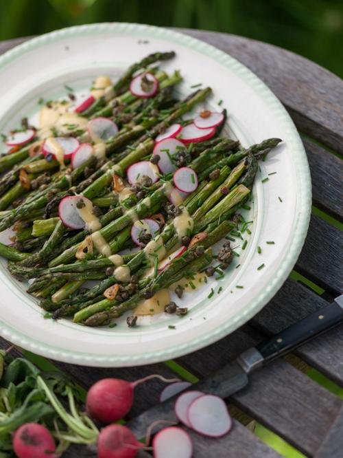 Börja med majonnäsen. Bryn smöret i en stekpanna tills det doftar nöt och är ljusbrunt. Häll snabbt över smöret i en bunke för att avstanna stekningen och låt det svalna. Blanda äggulorna och senapen i en bunke. Tillsätt smöret lite i taget under ständig vispning, utan att bottensatsen kommer med. Smaka av med citronsaft, salt och svartpeppar. Förvara i rumstemperatur t ex ovanpå spisen i väntan på servering. Skär av den hårda nedre delen på sparrisen. Stek eller grilla sparrisen al dente i smör ca 4 min. Lägg sparrisen åt sidan och stek kaprisen tills den öppnar sig som små blommor. Lägg sparrisen på ett fat. Häll på lite majonnäs, kapris och klipp över gräslök och skivade rädisor. Servera med resten av majonnäsen vid sidan av och ett gott bröd.
