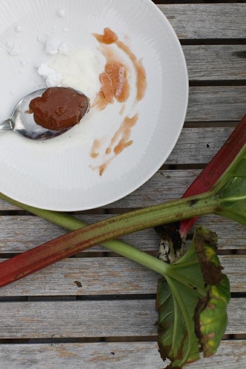 Skafferiet ekar tomt, det är långt till närmsta affär och trägårdens juveler börjar tappa glansen. Vad gör man? En sötsylig kolasås på sommarens träigaste rabarber överraskade både glassen och grädden. Vad marängerna tyckte vet jag inte men de trivdes i sällskapet även om de hade föredragit en mindre söt kamrat, kanske några syrliga bär. Nu blev smaskigt och mastigt dagens ord.