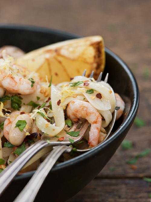 Skala och finhacka vitlöksklyftorna och grovhacka bladpersiljan. Riv skalet av den ena citronen. Dela den andra citronen i klyftor. Skölj bönorna. Koka pastan. Stek citronklyftorna i 1 msk smör med snittsidan nedåt tills de blir gyllenbruna. Ta upp dem och lägg åt sidan. Sänk värmen och stek vitlöken på svag värme i resterande smör. Vänd ner räkorna, persiljan och bönorna och låt allt bli varmt utan att koka. Krydda med salt, peppar eller chiliflakes. Blanda med pastan. Toppa med citronskal och de stekta citronklyftorna.