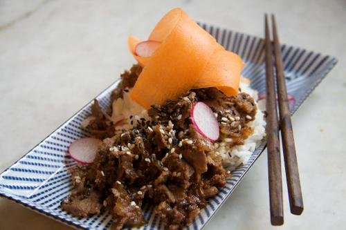 Skala och strimla purjolöken och finhacka vitlöken. Fräs den mjuk i oljan. Tillsätt den lätt-tinade skaven och bryn den runt om ca 5 min. Riv ingefäran fint och blanda med soja och socker och häll på. Strö över sesamfrön. Servera med ris och grönsaker.